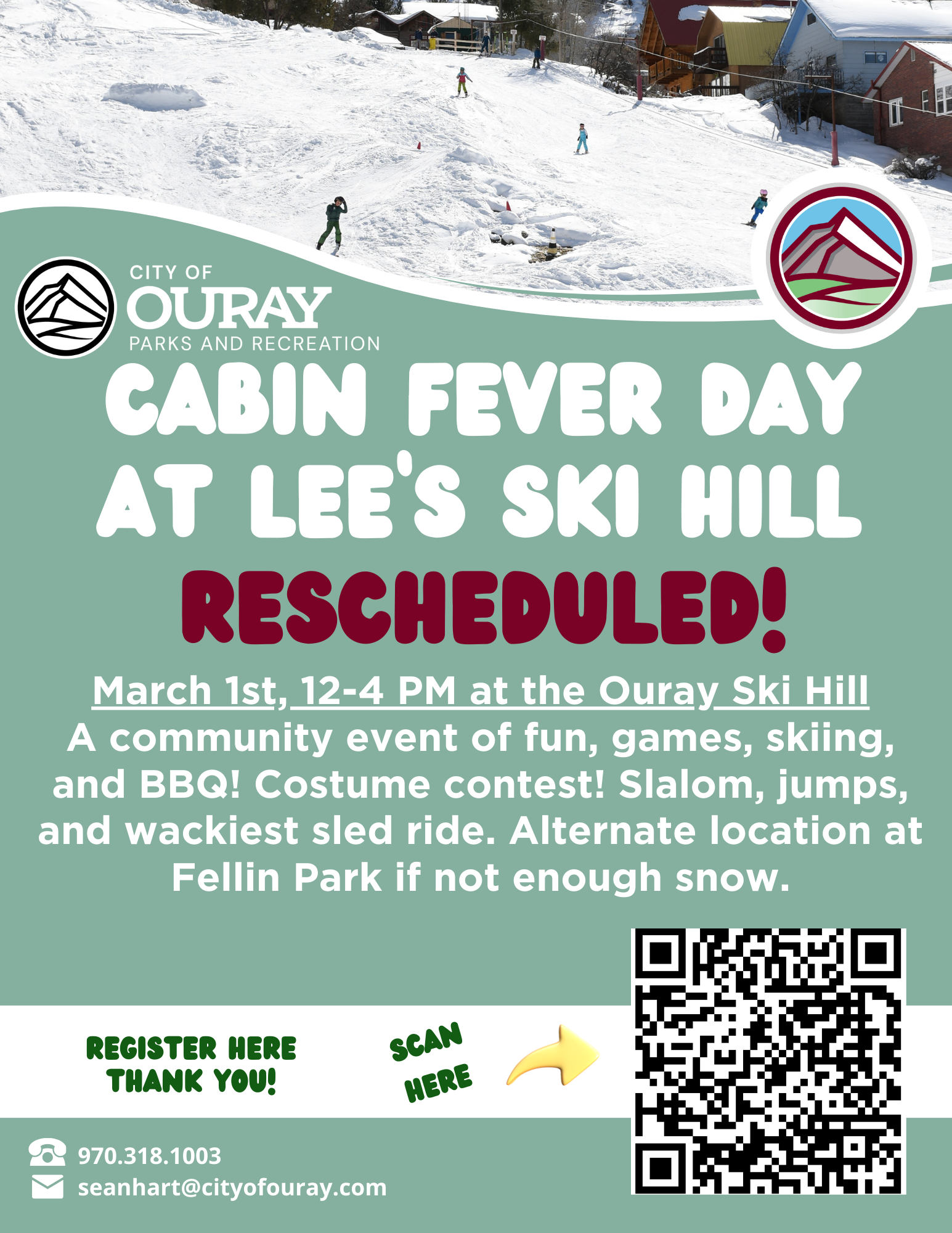 Join Ouray Parks and Rec at Lee's Ski Hill on March 1st from 12-4pm. A community event of fun, games, skiing, BBQ, and a costume contest! Alternate location at Fellin Park, if not enough snow. Register with the QR code.